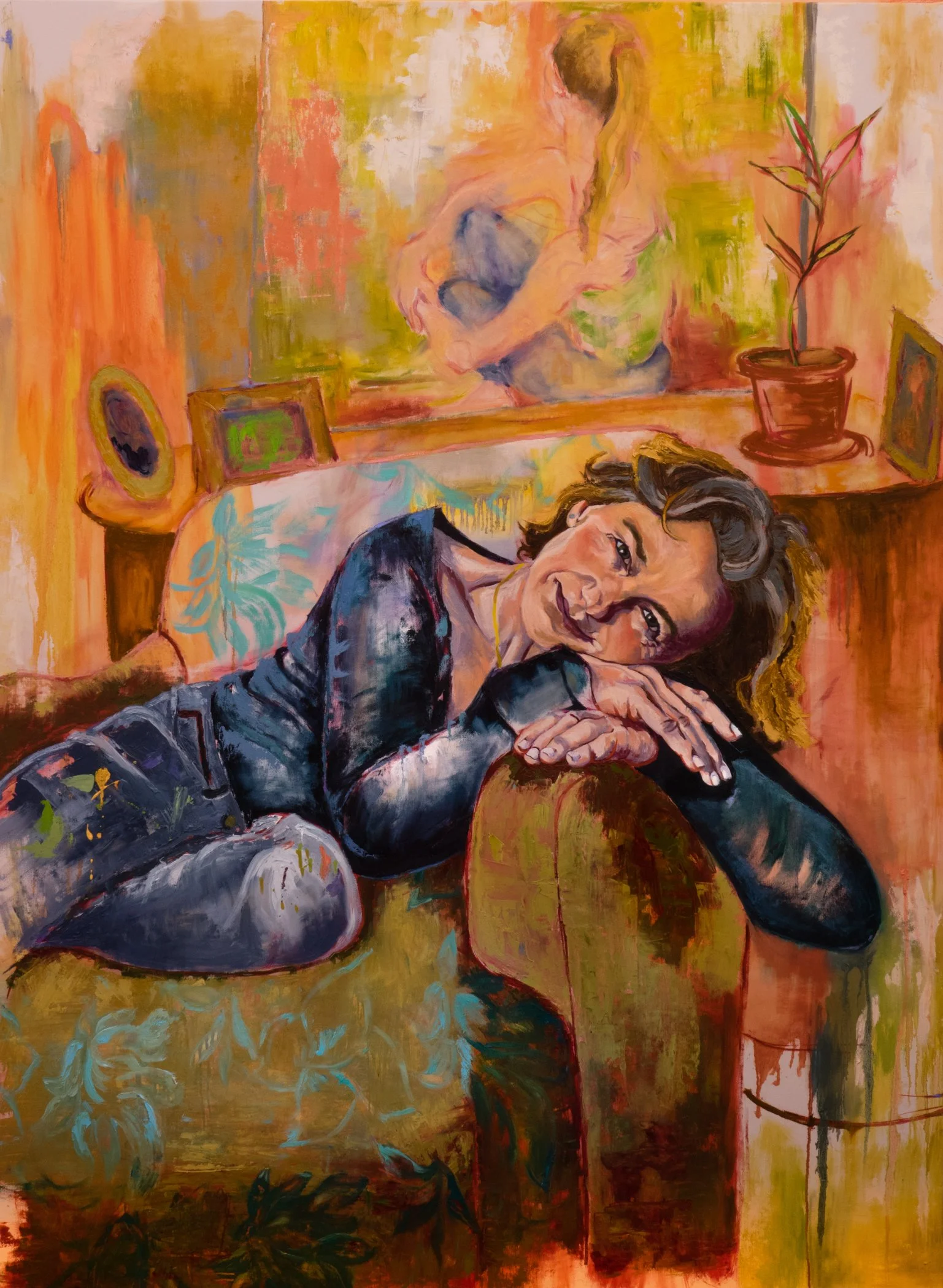 Her process is intuitive. A passing feeling, a moment of clarity, or an unexpected shape might spark the beginning of a painting. She sketches—not to plan, but to understand—and then paints in order to fully express the emotion at hand. Her mark-making is bold and open, her palette fearless. Each work carries a sense of immediacy and intention, guided by a commitment to capturing what’s real and resonant.